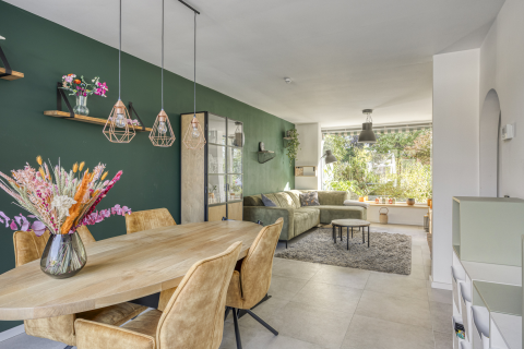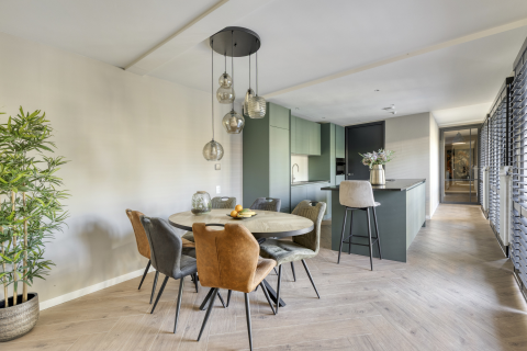 De voormalige woonkamer en keuken zijn samengevoegd tot één grote leefruimte, waardoor je profiteert van een ruimtelijk en praktisch geheel. De eethoek bevindt zich recht tegenover de keuken in de aanbouw: een centrale plek waar je samen eet, knutselt of de dag bespreekt. Wil je liever een speelhoek voor de kinderen? Dan richt je deze ruimte eenvoudig opnieuw in zodat alles beneden bij elkaar blijft – ideaal voor gezinnen.